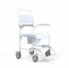 Кресло-коляска имеет 4 маленьких и 2 больших задних съемных колеса. Большие колёса позволяют пользователю передвигаться на стуле без посторонней помощи. Тормоза на каждом колесе позволяют зафиксировать кресло на месте, если это необходимо. Подножки кресла-туалета можно снять.